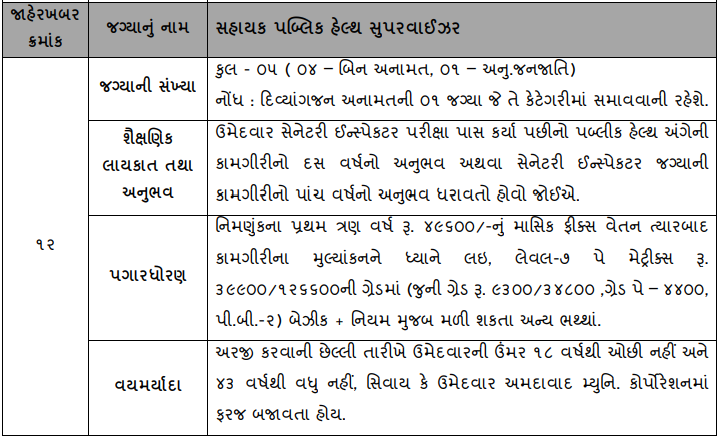 અમદાવાદ મ્યુનિસિપલ કોર્પોરેશન એ તાજેતરમાં સહાયક પબ્લીક હેલ્થ સુપરવાઈઝર ની 5 ખાલી જગ્યાઓ ભરવા માટે એક નોટિસ બહાર પાડી છે. જેમાં જરૂરી લાયકાત ધરાવતા ઉમેદવારોની ઓનલાઈન અરજી સ્વીકારવામાં આવે છે.