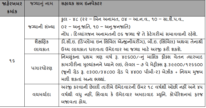 અમદાવાદ મ્યુનિસિપલ કોર્પોરેશન એ તાજેતરમાં સહાયક સબ ઇન્સસ્પેકટર ની 48 ખાલી જગ્યાઓ ભરવા માટે એક નોટિસ બહાર પાડી છે. જેમાં જરૂરી લાયકાત ધરાવતા ઉમેદવારોની ઓનલાઈન અરજી સ્વીકારવામાં આવે છે.