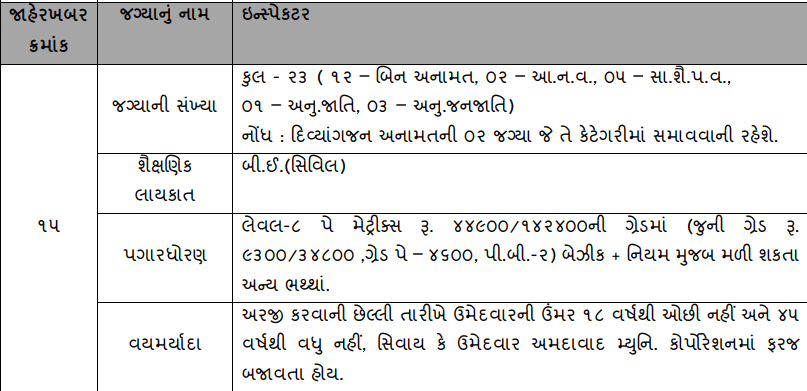 અમદાવાદ મ્યુનિસિપલ કોર્પોરેશન એ તાજેતરમાં ઇન્સ્પેક્ટર ની 23 ખાલી જગ્યાઓ ભરવા માટે એક નોટિસ બહાર પાડી છે. જેમાં જરૂરી લાયકાત ધરાવતા ઉમેદવારોની ઓનલાઈન અરજી સ્વીકારવામાં આવે છે.