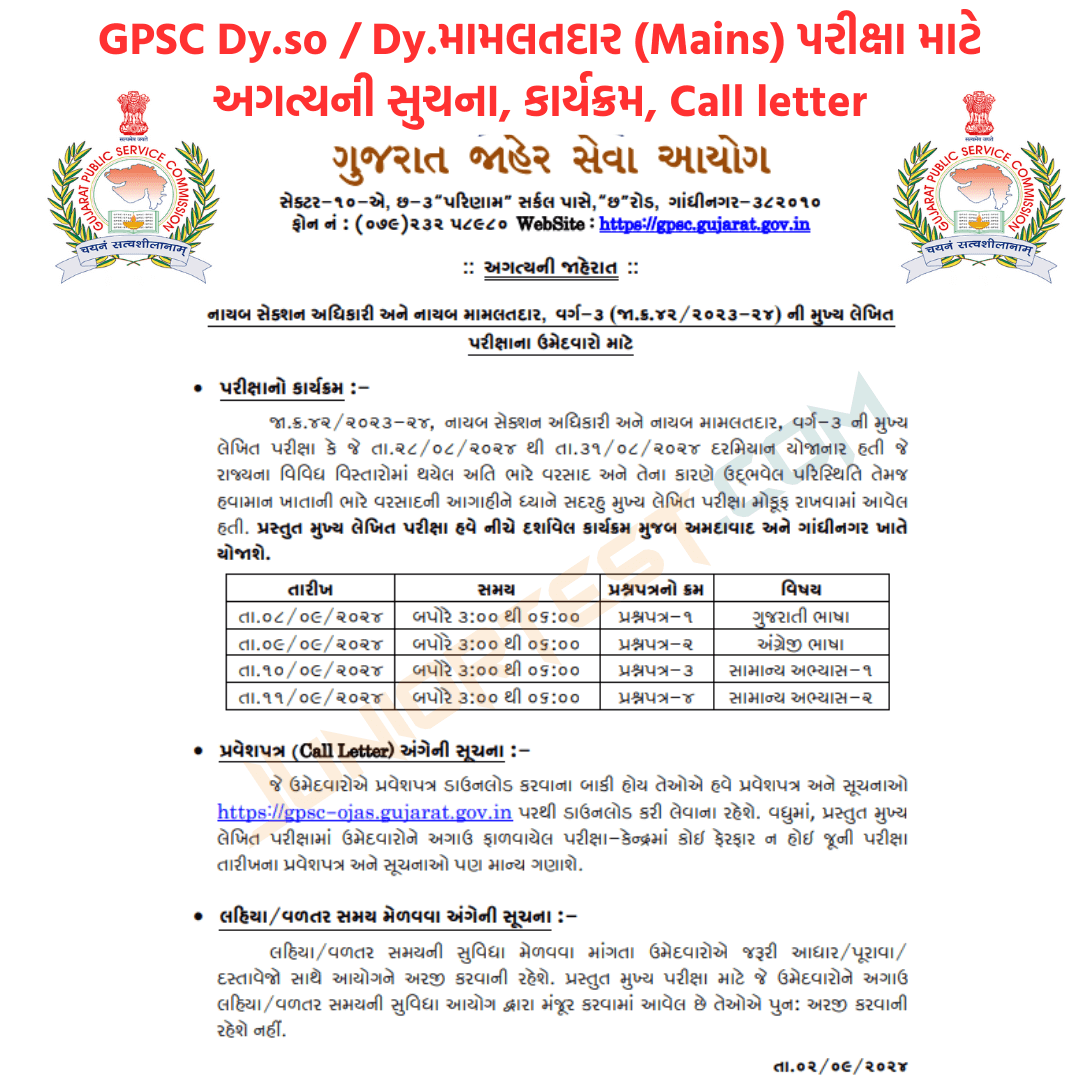 નાયબ સેક્શન અધિકારી અને નાયબ મામલતદાર, વર્ગ-૩ (જા.ક્ર.૪૨/૨૦૨૩-૨૪) ની મુખ્ય લેખિત પરીક્ષાના ઉમેદવારો માટે