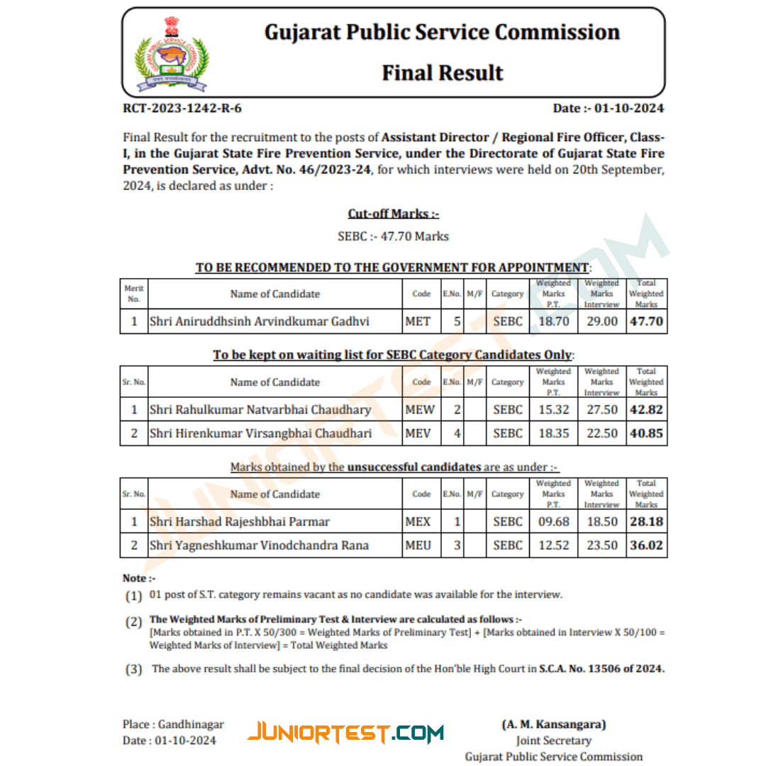 GPSC Assistant Director/ Regional Fire Officer કટ-ઓફ માર્ક્સ જાહેર