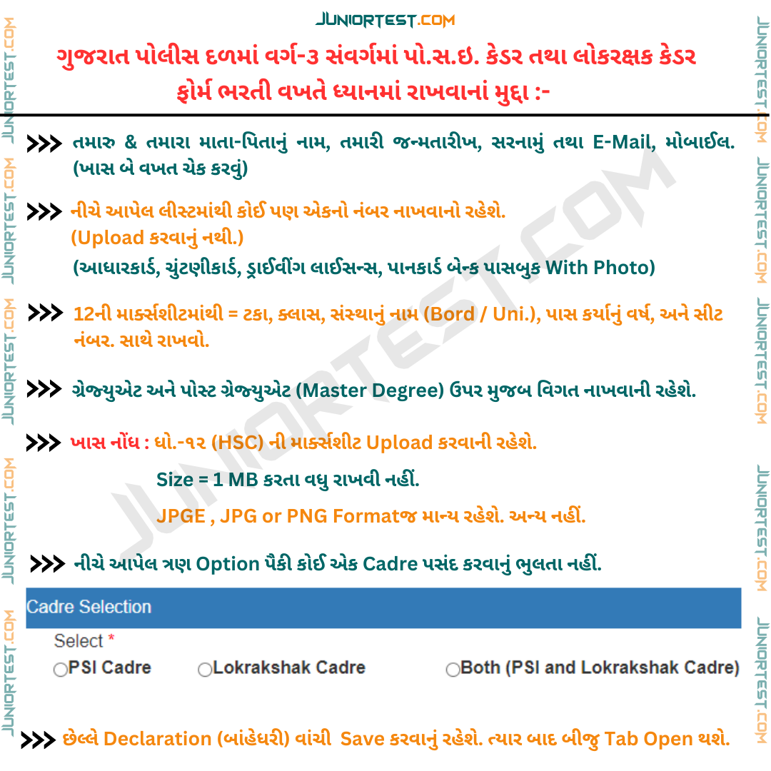 ફોર્મ ભરતી વખતે ધ્યાનમાં રાખવાનાં મુદ્દામાં નીચે આપેલ Image માં જણાવવામાં આવેલ માહીતી આપે ફોર્મ ભરતી વખતે ડોક્યુમેન્ટ સાથે રાખવા જરૂરી છે.