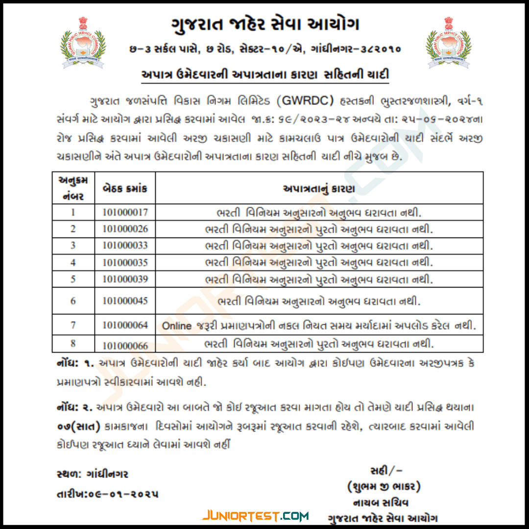 GPSC દ્વારા અપાત્ર ઉમેદવારોની યાદી જાહેર (Advt No. 69/2023-24)