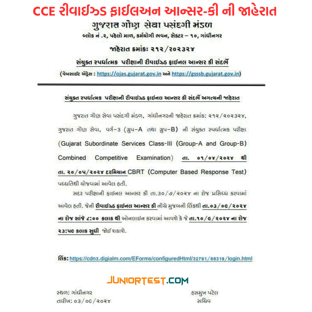 સંયુક્ત સ્પર્ધાત્મક પરીક્ષાની રીવાઇઝ્ડ ફાઇનલ આન્સર કી સંદર્ભે અગત્યની જાહેરાત