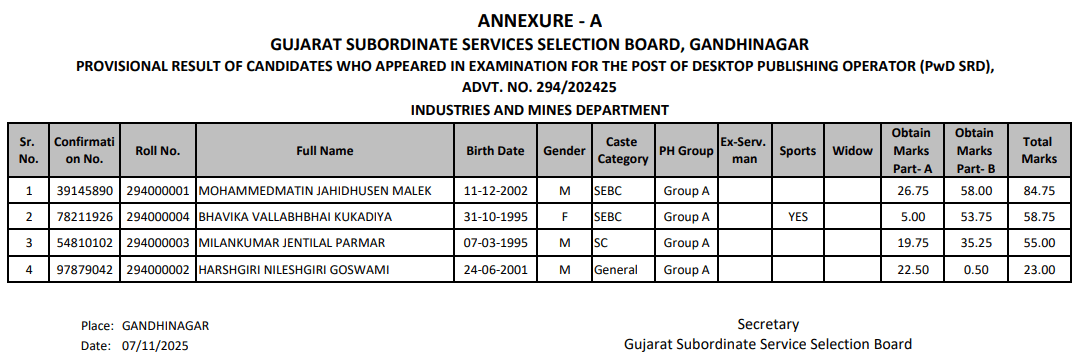 જાહેરાત ક્રમાંકઃ ૨૯૪/૨૦૨૪૨૫, ડેસ્કટોપ પબ્લીસીંગ ઓપરેટર (દિવ્યાંગ ઉમેદવારો માટે ખાસ ભરતી ઝુંબેશ), વર્ગ-૩ સંવર્ગની પરીક્ષામાં હાજર રહેલ તમામ ઉમેદવારોએ મેળવેલ ગુણ જાહેર કરવા બાબતની અગત્યની જાહેરાત