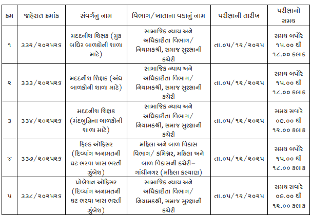જાહેરાત ક્રમાંક: ૩૩૨/૨૦૨૫૨૬, ૩૩૩/૨૦૨૫૨૬, ૩૩૪/૨૦૨૫૨૬, ૩૩૭/૨૦૨૫૨૬, ૩૩૮/૨૦૨૫૨૬ વર્ગ-૩ સંવર્ગોની સ્પર્ધાત્મક કસોટીની તારીખ અંગેની અગત્યની સૂચના