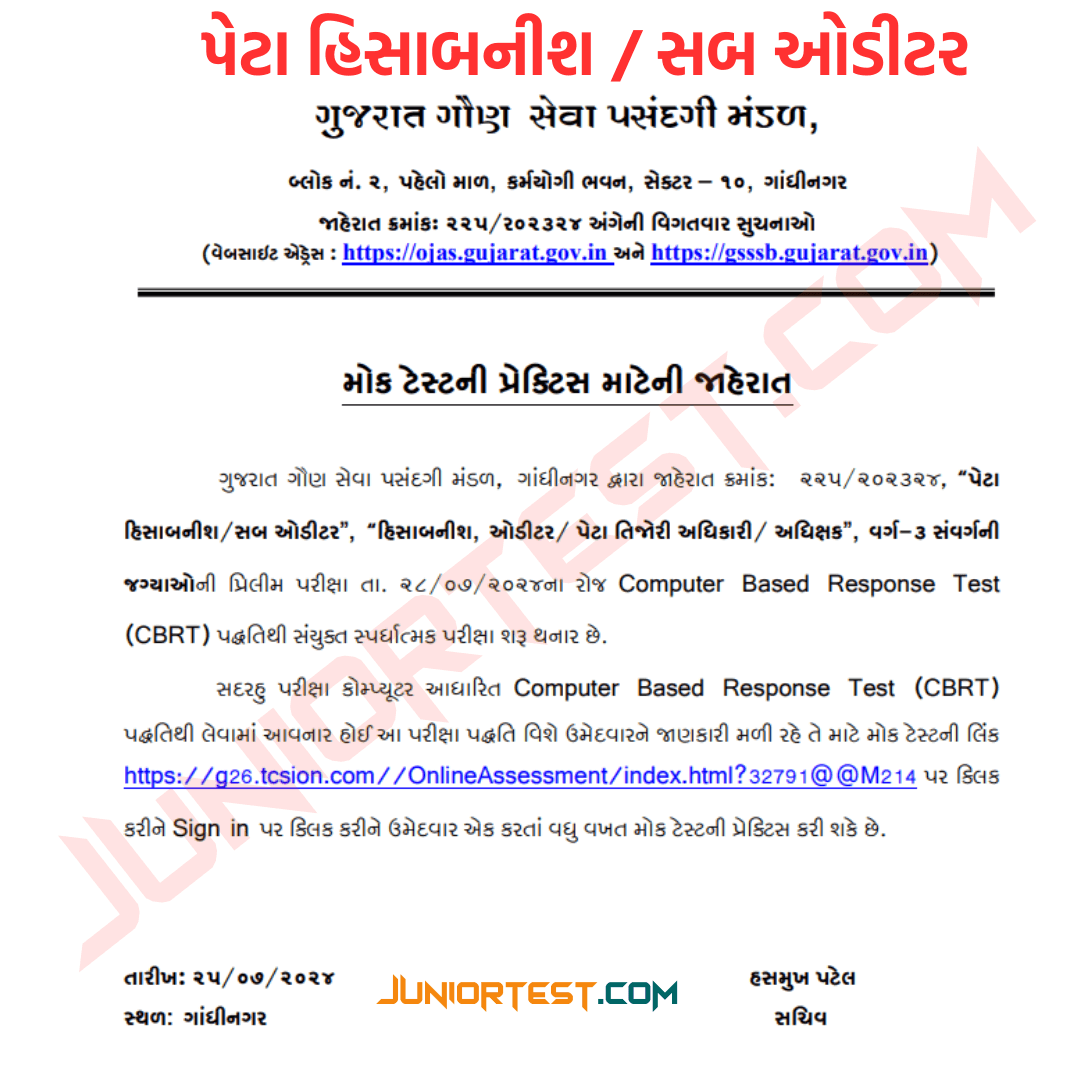 ખાસ નોંધ : મીત્રો અહીં મંડળ દ્વારા માત્ર 25 MCQ પ્રેક્ટીસ કરવા માટે અને online કઈ રીતે પરીક્ષા પધ્ધતિ રહેશે. તેની માહીતી પ્રેક્ટીસ દ્વારા જણાવવામાં આવેલ છે. 100 Marks ની મોકટેસ્ટ અહીં આપવામાં આવી નથી.