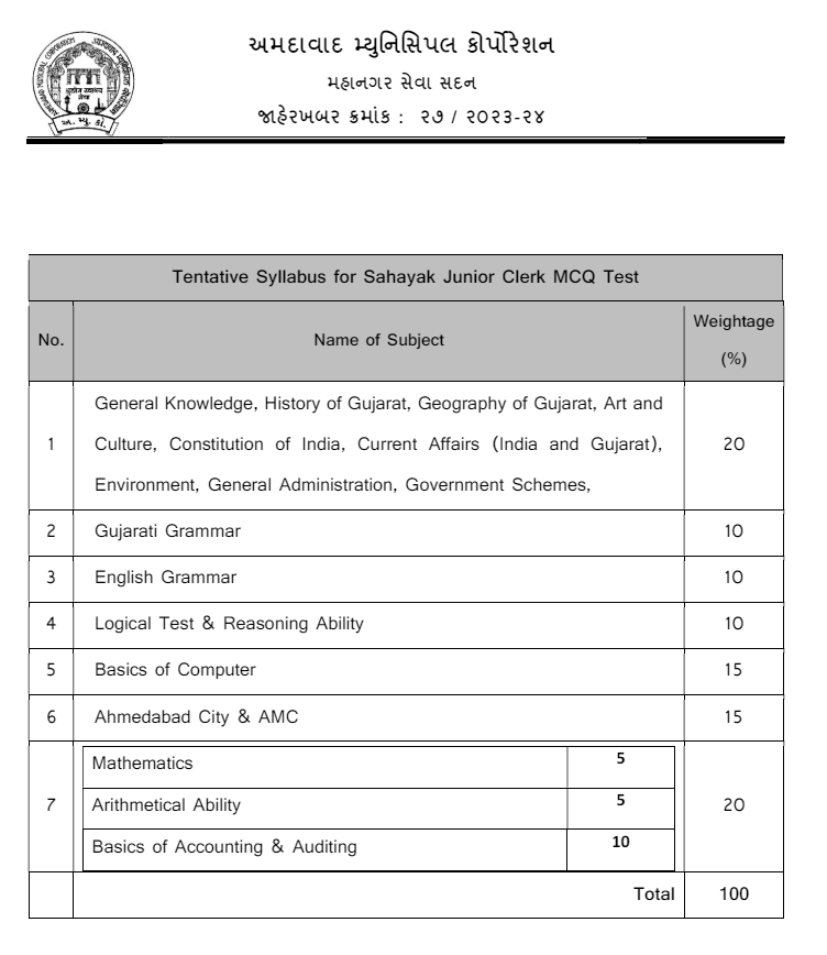 👉 AMC Junior Clerk નો અભ્યાસક્રમ : 👇
