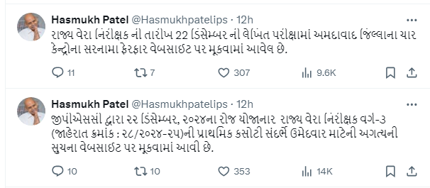 જાહેરાત ક્રમાંક : ૨૮/૨૦૨૪-૨૫, રાજ્ય વેરા નિરીક્ષક, વર્ગ-૩ ની પ્રાથમિક કસોટી તા.૨૨/૧૨/૨૦૨૪, રવિવારના રોજ સવારે ૧૧:૦૦ થી ૦૧:૦૦ દરમિયાન યોજાનાર છે. પ્રસ્તુત પરીક્ષામાં પરીક્ષા કેન્દ્ર ખાતે ઉમેદવારો પારદર્શક પાણીની બોટલ (કોઇ પણ લખાણ વગર), પારદર્શક Writing Pad, પારદર્શક Pouch તેમજ સાદી ઘડિયાળ સાથે રાખી શકશે.