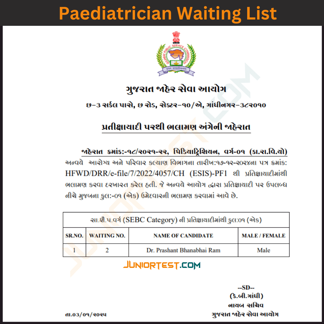 GPSC દ્વારા Paediatrician Waiting List જાહેર
