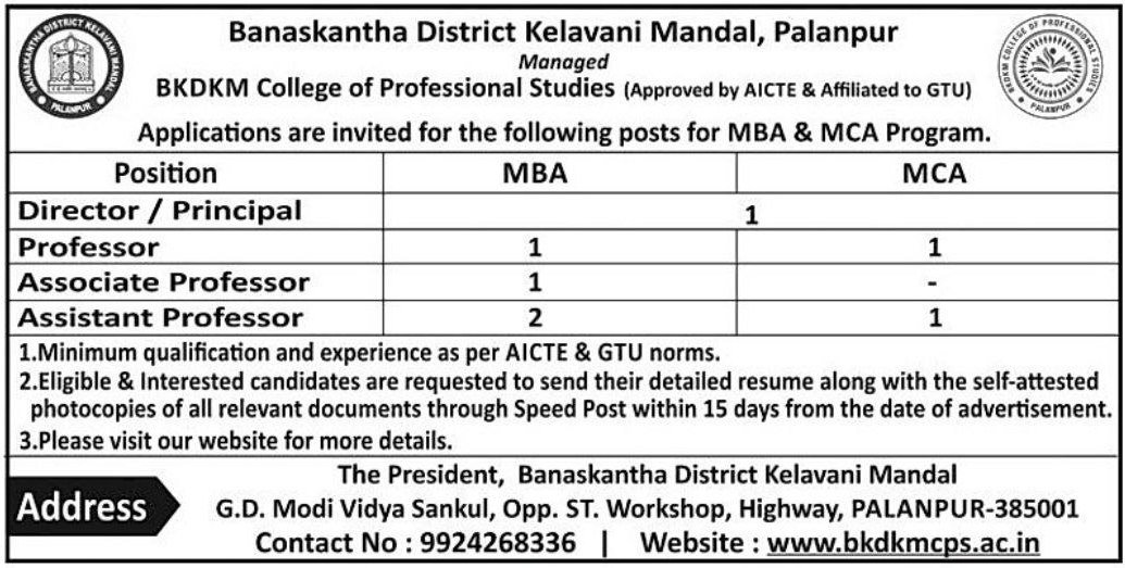 BKDKM College Palanpur Recruitment 2026 : The Banaskantha District Kelavani Mandal (BKDKM), Palanpur, has officially announced a new recruitment drive for its managed institution, BKDKM College of Professional Studies. This recruitment is specifically for faculty and administrative positions within the MBA and MCA programs. The college is approved by AICTE and affiliated with Gujarat Technological University (GTU).