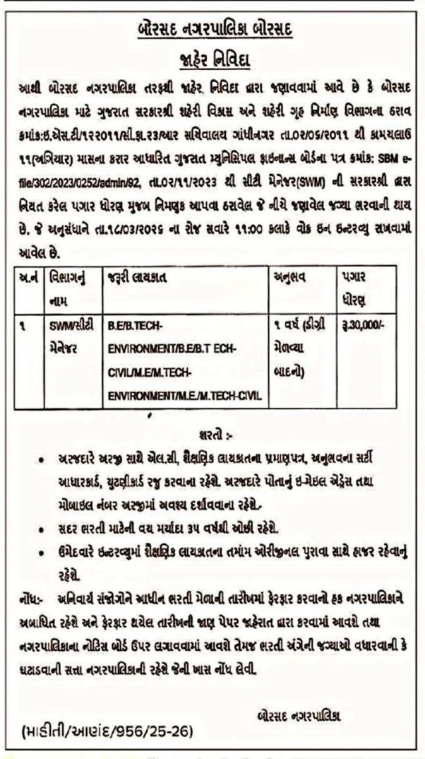 Borsad Nagarpalika Recruitment 2026 : Borsad Nagarpalika has published an official advertisement for the recruitment of a City Manager (SWM) on a temporary contract basis for a period of 11 months. This recruitment is being conducted under the guidelines of the Urban Development and Urban Housing Department, Gujarat. Candidates holding a degree in Civil or Environmental Engineering with relevant experience are invited to attend the walk-in interview.