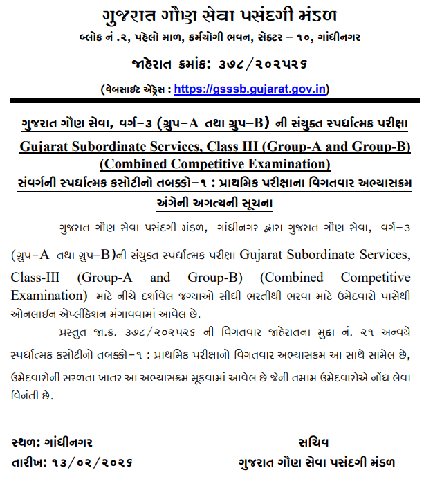 About CCE 2026 Details Syllabus : Gujarat Subordinate Services, Class-III (Group-A and Group-B) Combined Competitive Examination (Combined Competitive Examination) has been invited from the candidates for filling the following posts through direct recruitment by the Gujarat Subordinate Services Recruitment Board, Gandhinagar. Presented Advt No. 378/202526 Detailed Advertisement under Issue No. 21 for Competitive Test Stage – 1: Detailed syllabus of Preliminary Examination is enclosed herewith, for the convenience of the candidates, this syllabus has been placed, which all the candidates are requested to take note of.