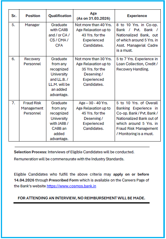 Cosmos Bank Recruitment 2026 : Interested candidates possessing the requisite educational qualifications and extensive banking experience are highly encouraged to apply. This is a tremendous opportunity for seasoned bankers to elevate their careers and join the executive and managerial cadres of one of the most prominent co-operative banks in the country. Candidates must carefully review the specific experience requirements and age limits calculated as of 31st March 2026, and ensure their applications are submitted on or before the final deadline of 14th April 2026.