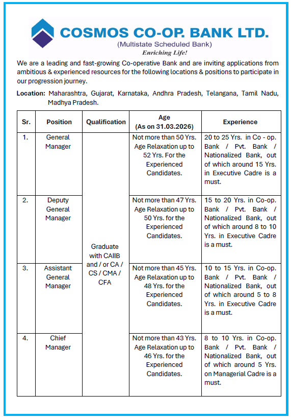Cosmos Bank Recruitment 2026 : The Cosmos Co-operative Bank Ltd., a leading and fast-growing Multistate Scheduled Bank, has officially published an employment notification inviting applications from ambitious and experienced professionals. This major recruitment drive aims to fill various high-level managerial and specialised personnel positions, including General Manager, Deputy General Manager, Assistant General Manager, Chief Manager, Manager, Recovery Personnel, and Fraud Risk Management Personnel. These vacancies are distributed across multiple prime locations including Maharashtra, Gujarat, Karnataka, Andhra Pradesh, Telangana, Tamil Nadu, and Madhya Pradesh.