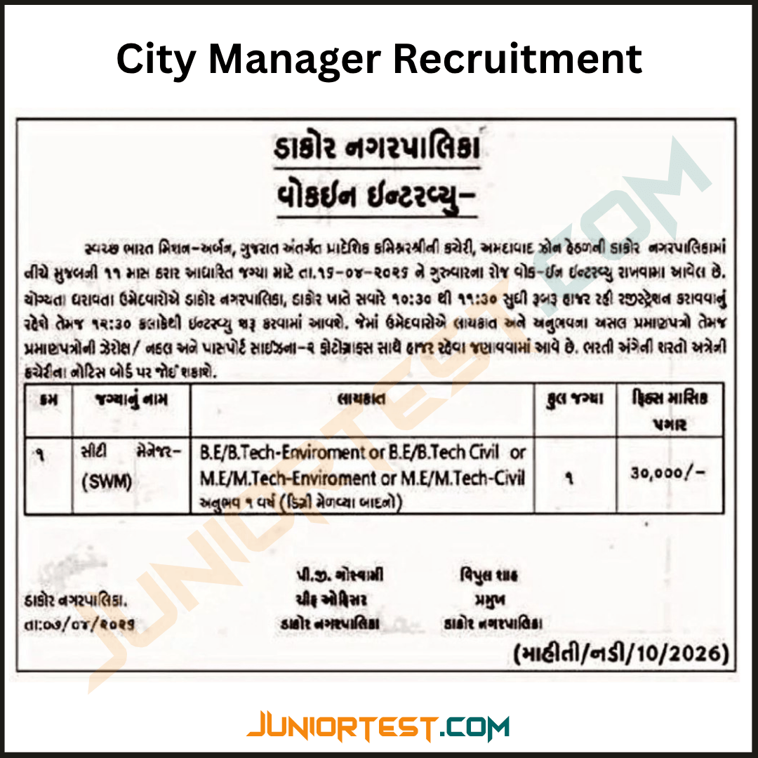Dakor Nagarpalika Recruitment 2026: Dakor Nagarpalika has released an official recruitment notification for the position of City Manager (Solid Waste Management – SWM) under the Swachh Bharat Mission – Urban (SBM-U) for the Ahmedabad Zone. This recruitment is being conducted on a purely contractual basis for a period of 11 months. Eligible candidates with an engineering background in Environment or Civil fields are invited to participate in the walk-in interview scheduled for April 2026.