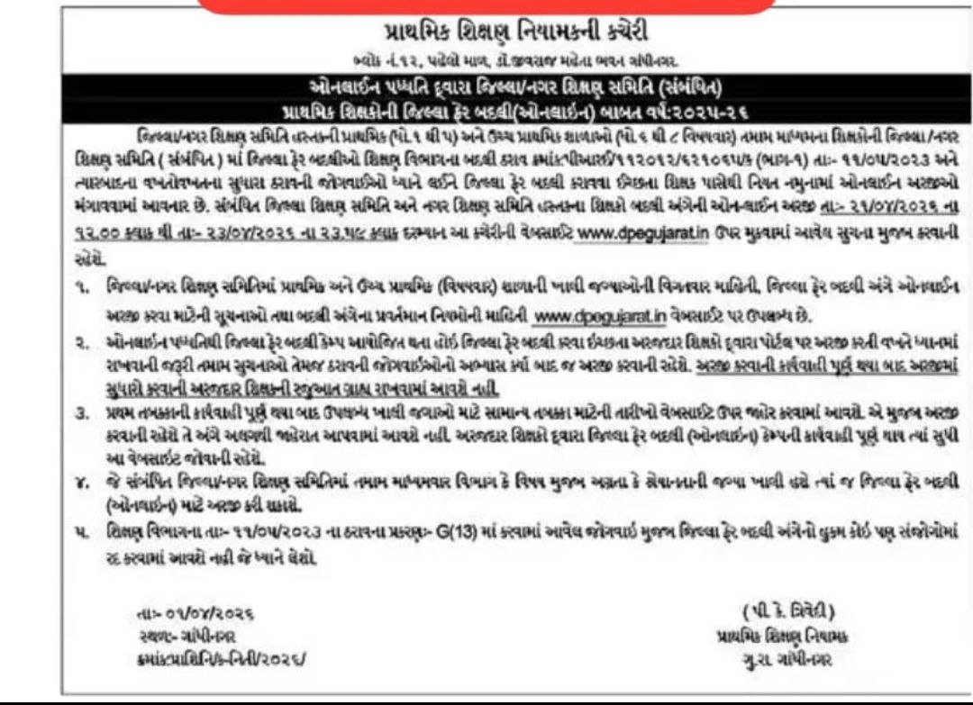 DPE Gujarat District Transfer 2026 : The Directorate of Primary Education (DPE), Gandhinagar, has officially released the notification for the Online District Transfer (Jilla Fer Badli) process for Primary Teachers for the academic year 2025-26. This process is applicable to teachers serving in Primary Schools (Std 1 to 5) and Upper Primary Schools (Std 6 to 8) under various District and City Education Committees across Gujarat.