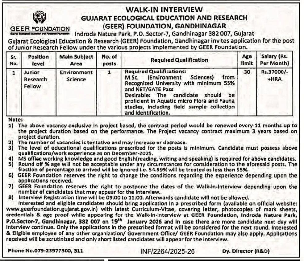 GEER Foundation Recruitment 2026, The Gujarat Ecological Education and Research (GEER) Foundation, Gandhinagar, has announced a Walk-in Interview for the recruitment of a Junior Research Fellow (JRF). This recruitment is for a specific project implemented by the GEER Foundation.