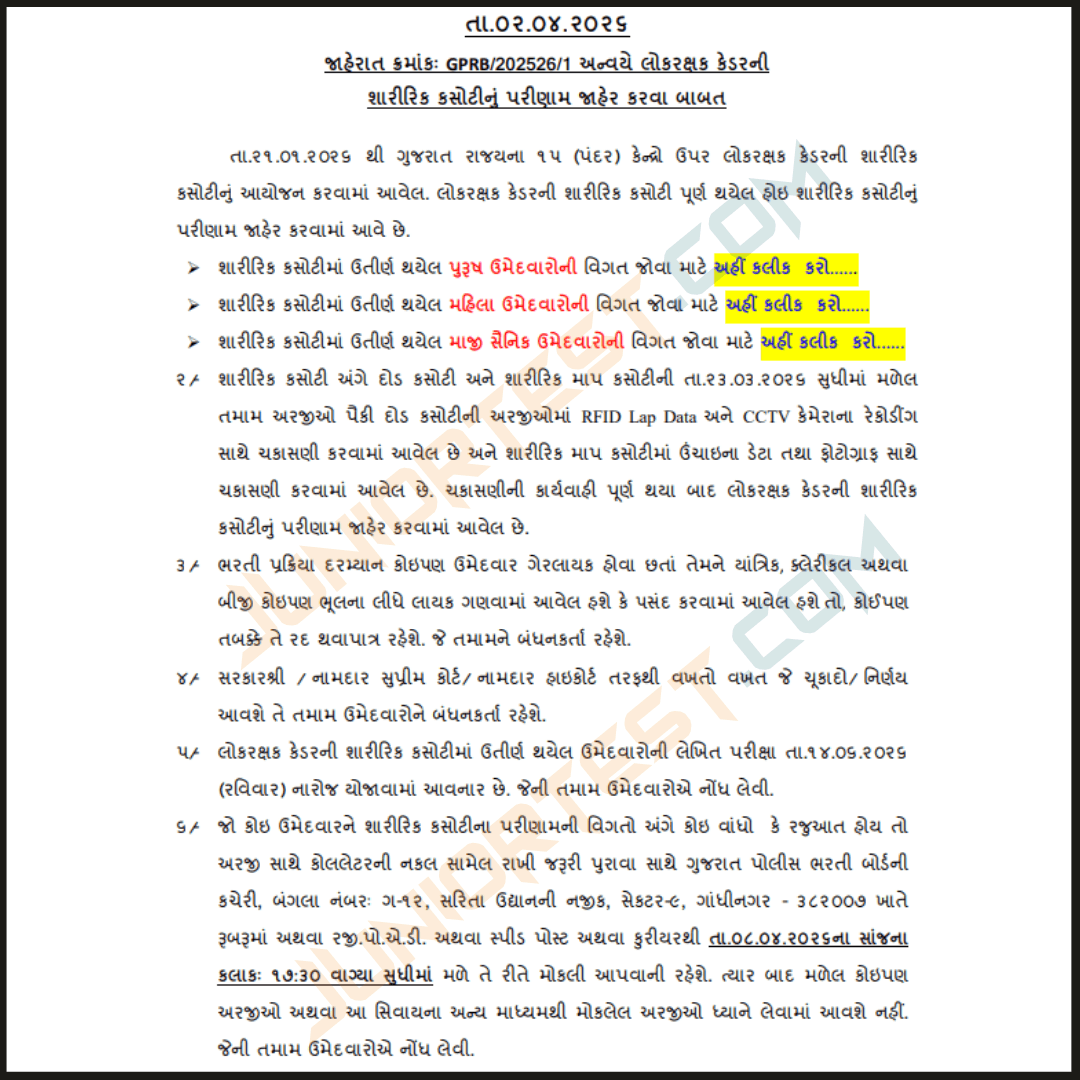 GPRB LRD Physical Test Result 2026 : The Gujarat Police Recruitment Board (GPRB) has officially announced the results for the Physical Efficiency and Measurement Tests conducted for the Lokrakshak (LRD) cadre recruitment (Advertisement No. GPRB/202526/1). Candidates who appeared for the physical tests, which commenced on January 21, 2026, at 15 different centers across Gujarat, can now check their results.