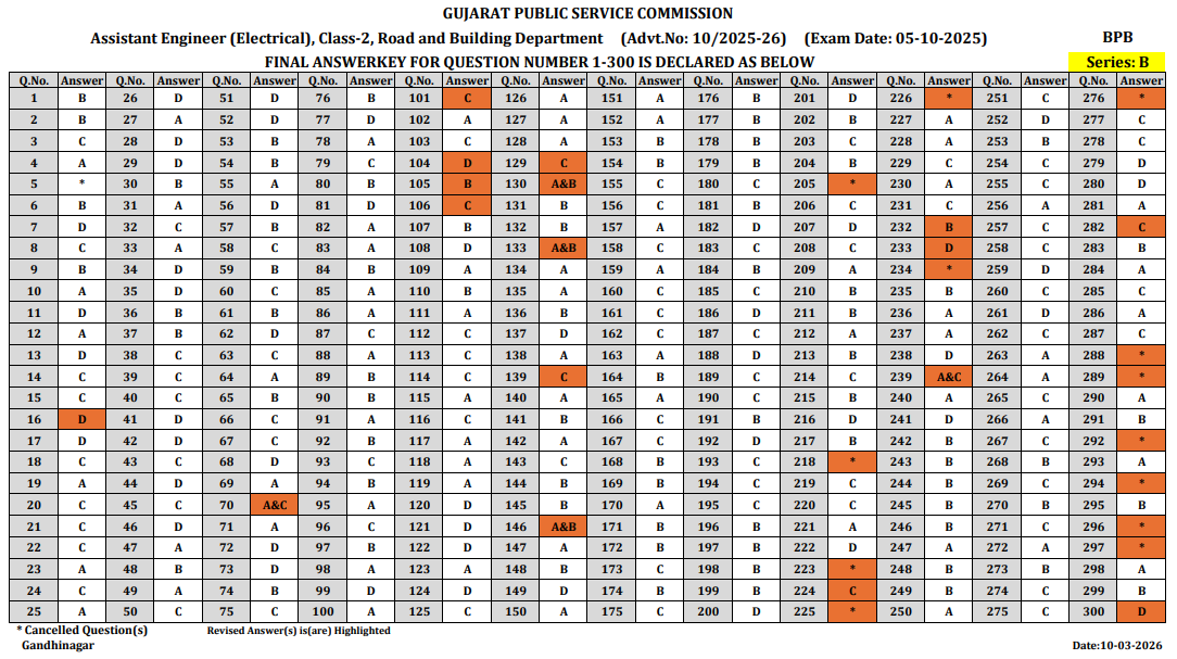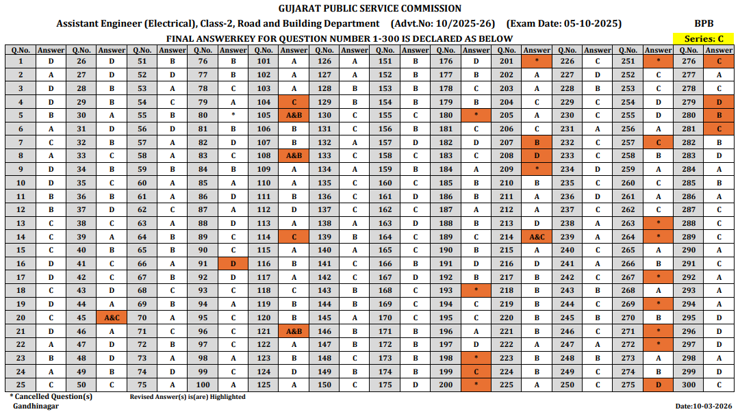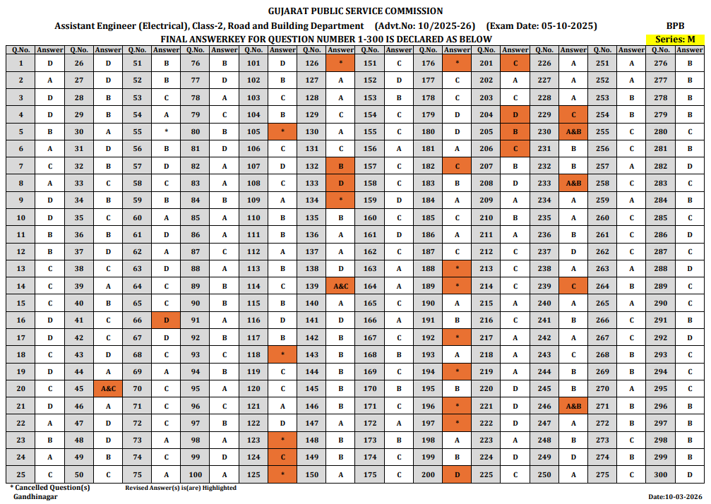 GPSC Assistant Engineer Final Answer Key 2025 : Advt No 10/2025-26 (Electrical) : Check your Final Score and download Question Paper With Final Answer Key