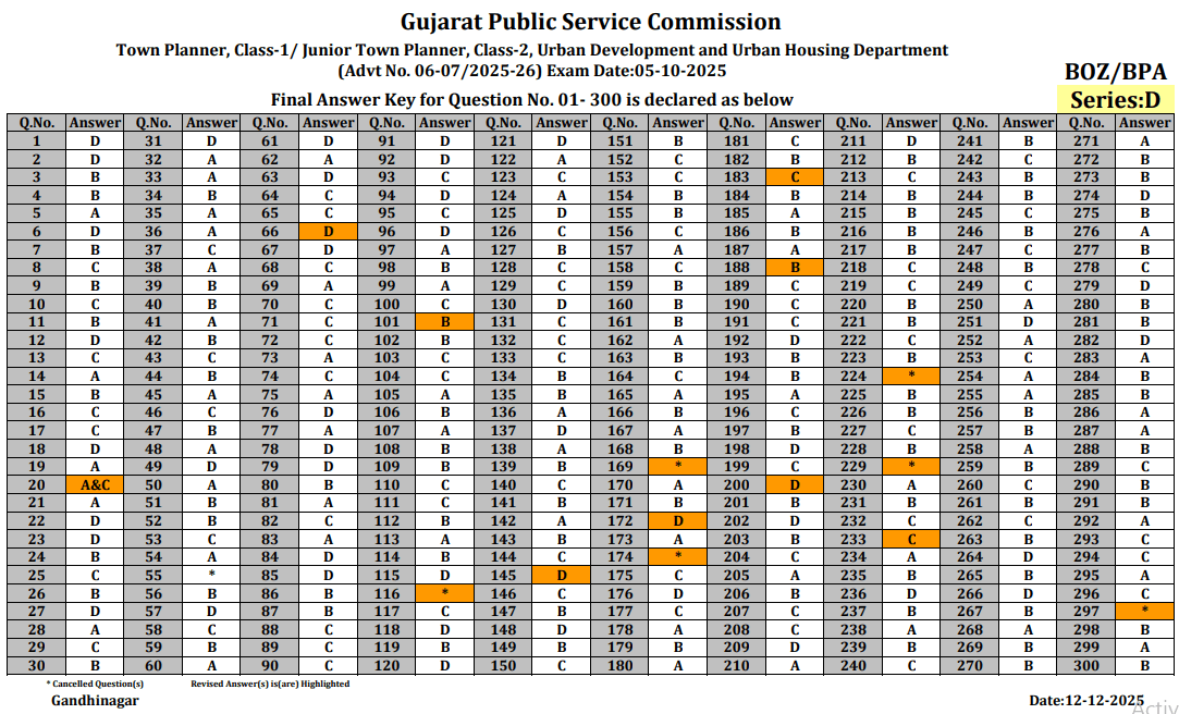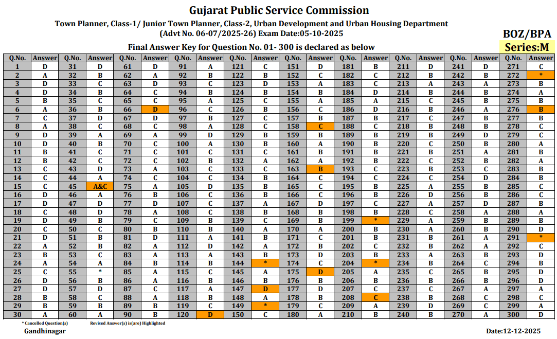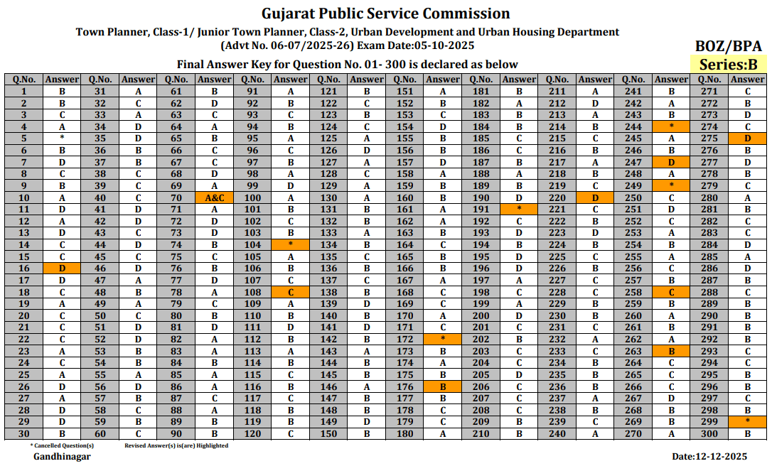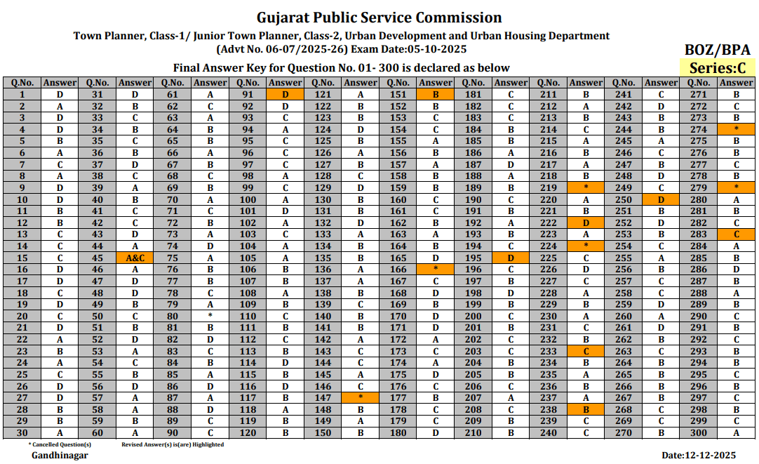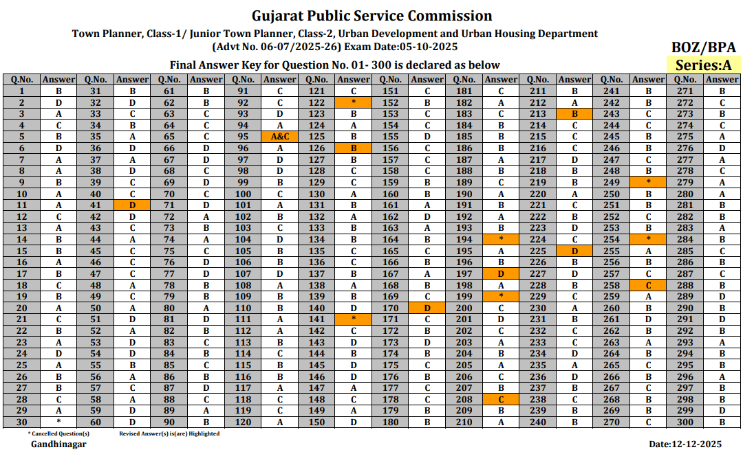 GPSC Town Planner Final Answer Key Gujarat Public Service Commission Town Planner, Class-1/ Junior Town Planner, Class-2, Urban Development and Urban Housing Department (Advt No. 06-07/2025-26) Exam Date: 05-10-2025 Final Answer Key for Question No. 01-300 is declared as below.