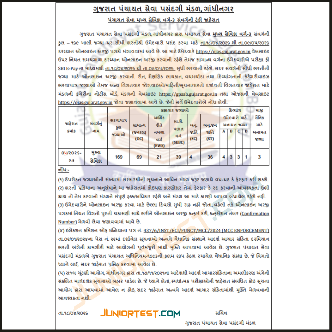 GPSSB Mukhya Sevika Recruitment 2026 : The Gujarat Panchayat Service Selection Board (GPSSB) has officially released a detailed recruitment notification for the post of Mukhya Sevika (Class-3). This is a golden opportunity for eligible female candidates seeking a career in the Gujarat government sector. A total of 169 vacancies have been announced across various districts of Gujarat.