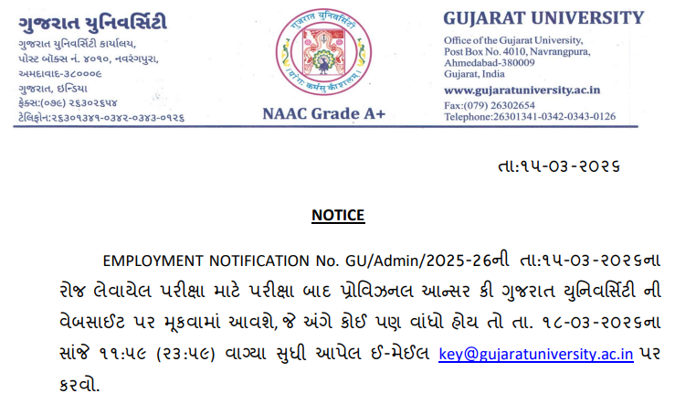 - If you find any incorrect answers, you must email your objections to key@gujaratuniversity.ac.in before the deadline on 18 March 2026 (11:59 PM).