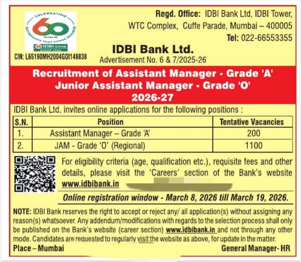 IDBI Bank Recruitment 2026 : IDBI Bank Ltd. has released an official recruitment advertisement (No. 6 & 7/2025-26) for the year 2026-27, inviting young and dynamic candidates to join as Assistant Manager – Grade ‘A’ and Junior Assistant Manager (JAM) – Grade ‘O’. This recruitment drive aims to fill 1300 vacancies in total, offering a prestigious career path in the banking sector. Candidates who are looking for a career with IDBI Bank should mark their calendars for the registration window opening in March 2026.