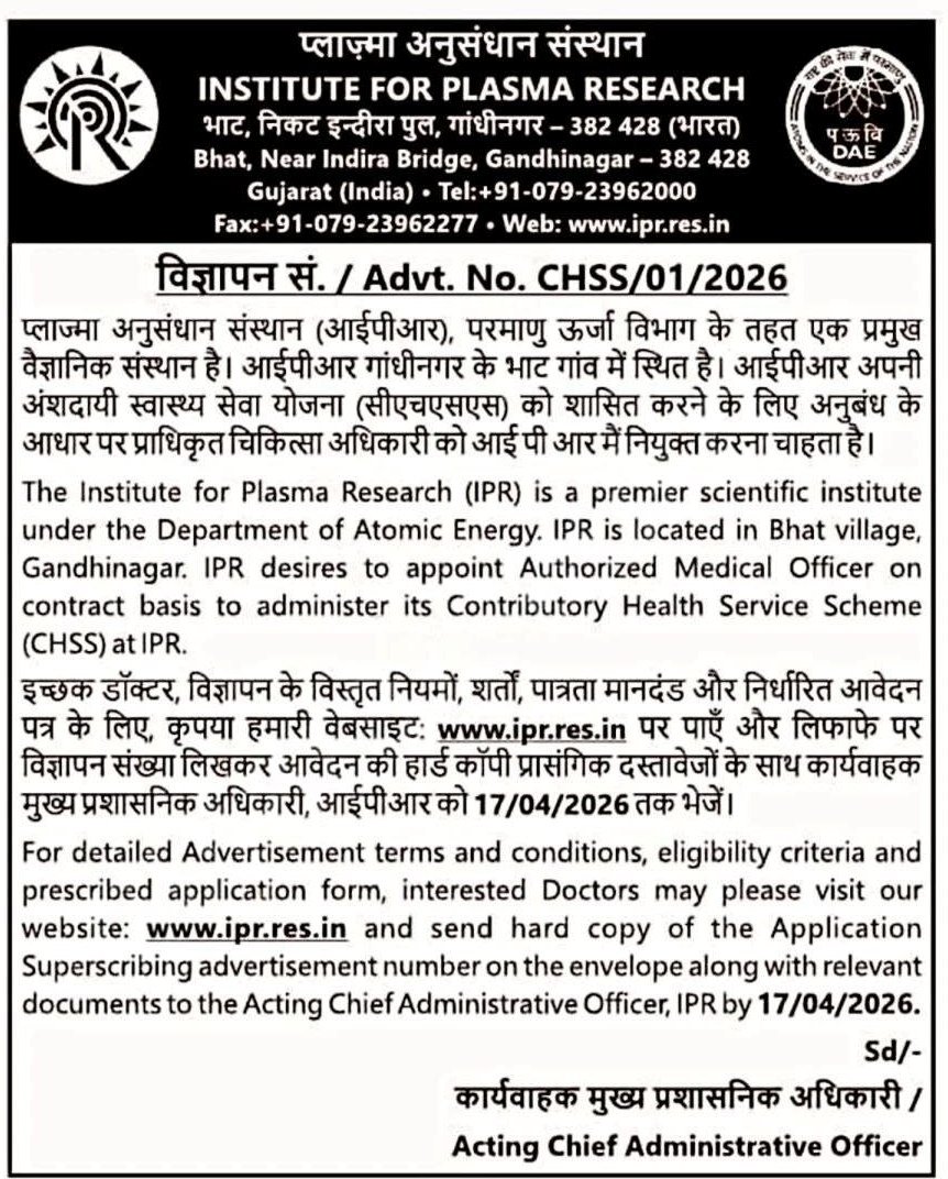 IPR Recruitment 2026 : The Institute for Plasma Research (IPR), a premier scientific institute under the Department of Atomic Energy, Government of India, has released an official recruitment notification for the year 2026. IPR is located in Bhat village, Gandhinagar, Gujarat. This latest IPR Recruitment 2026 aims to appoint an Authorized Medical Officer on a contract basis to administer its Contributory Health Service Scheme (CHSS)