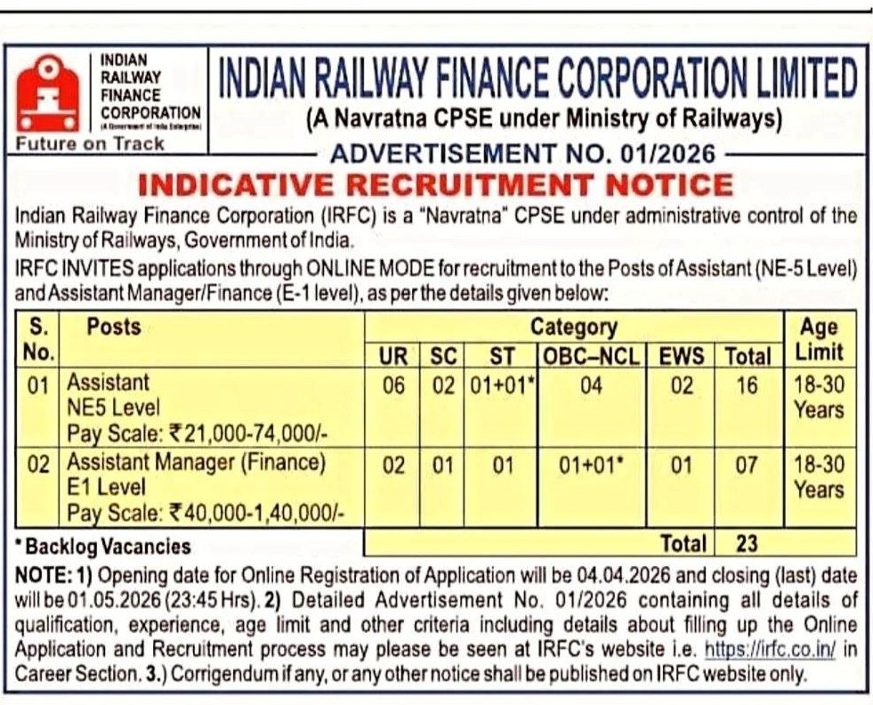 IRFC Recruitment 2026 : The Indian Railway Finance Corporation Limited (IRFC), a prestigious “Navratna” CPSE under the administrative control of the Ministry of Railways, Government of India, has released an indicative recruitment notice for the year 2026. This notification invites eligible candidates to apply through ONLINE MODE for various positions including Assistant (NE-5 Level) and Assistant Manager (Finance) (E-1 Level).