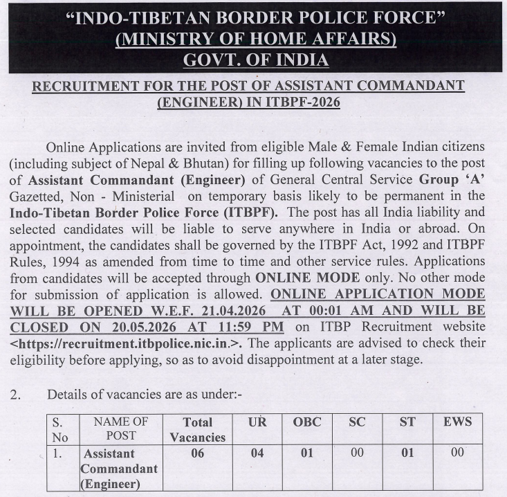 ITBP Recruitment 2026 : The Indo-Tibetan Border Police (ITBP) has released the official employment notification for the recruitment of Assistant Commandant (Engineer) for the year 2026. This recruitment drive offers a prestigious opportunity for eligible engineering graduates to join the Central Armed Police Forces under Group ‘A’ Gazetted Officer posts. A total of 06 vacancies have been announced for this elite role.