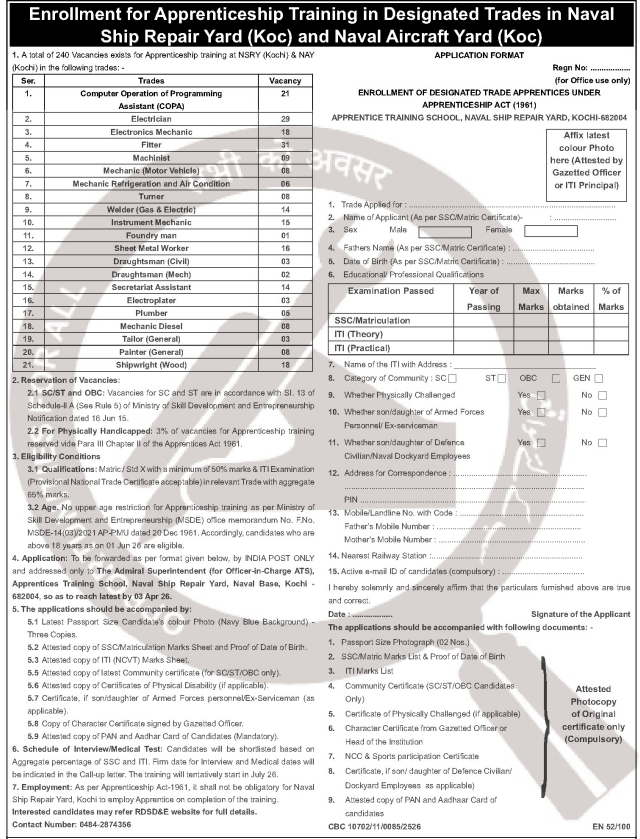 Vacancy Details: NSRY Kochi Apprentice Recruitment 2026