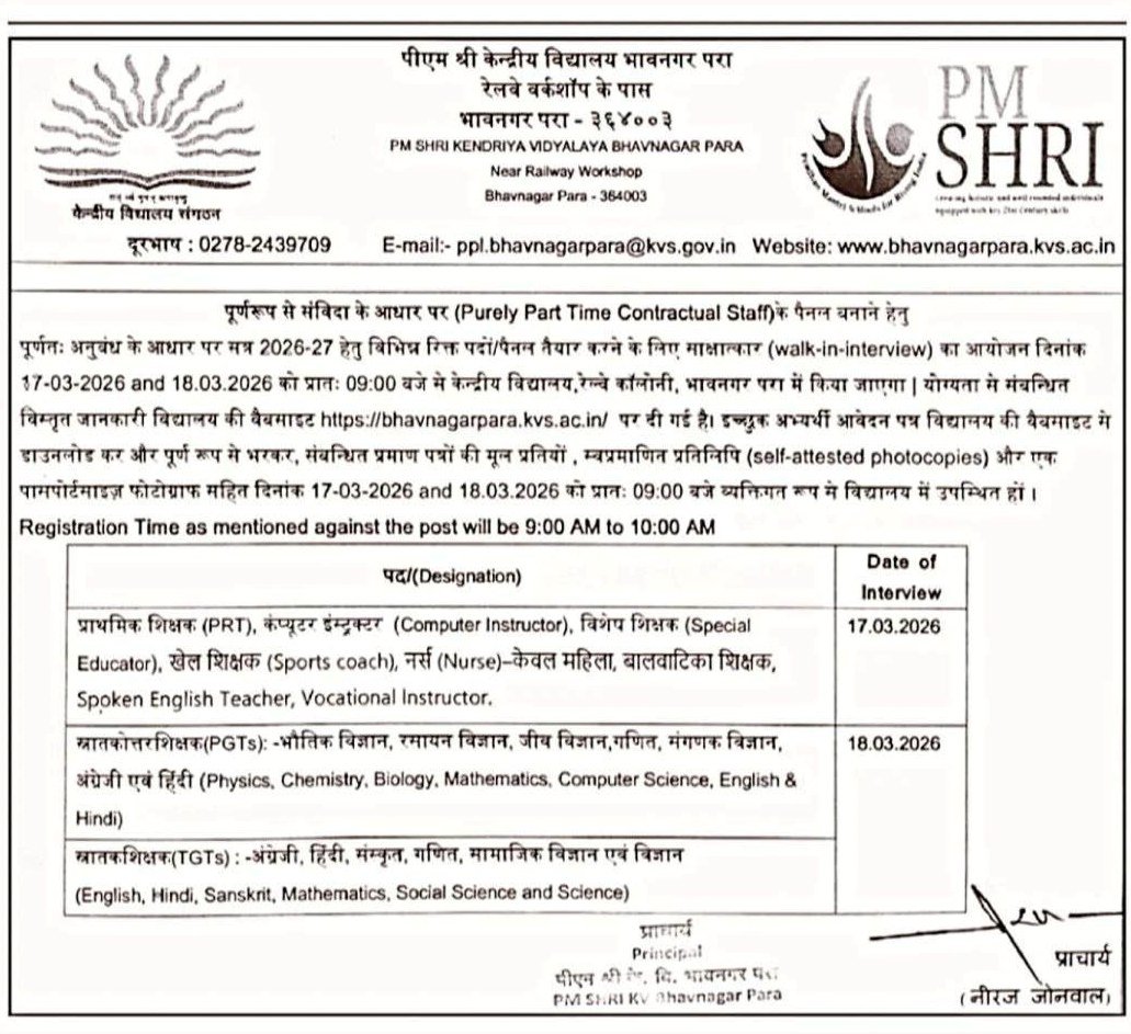 PM SHRI Kendriya Vidyalaya Recruitment 2026 : PM SHRI Kendriya Vidyalaya Bhavnagar Para has officially released a recruitment notification inviting eligible and interested candidates for the preparation of a panel of Purely Part Time Contractual Staff for the academic session 2026-27. This recruitment drive is aimed at filling various teaching and non-teaching positions including PGT, TGT, PRT, and other specialized roles. Candidates who are looking for a career in the education sector in Gujarat can take advantage of this walk-in interview opportunity.