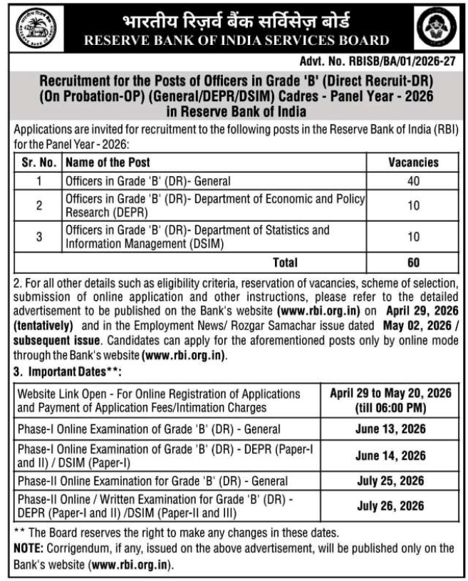 RBI Grade B Recruitment 2026 : Candidates interested in RBI Grade B Recruitment 2026 are encouraged to review the initial details provided in the short notice. The detailed advertisement is expected to be published on the official website and in Employment News in late April 2026. With a total of 60 vacancies, competition is expected to be high, and candidates should prepare according to the scheduled examination dates in June and July 2026.