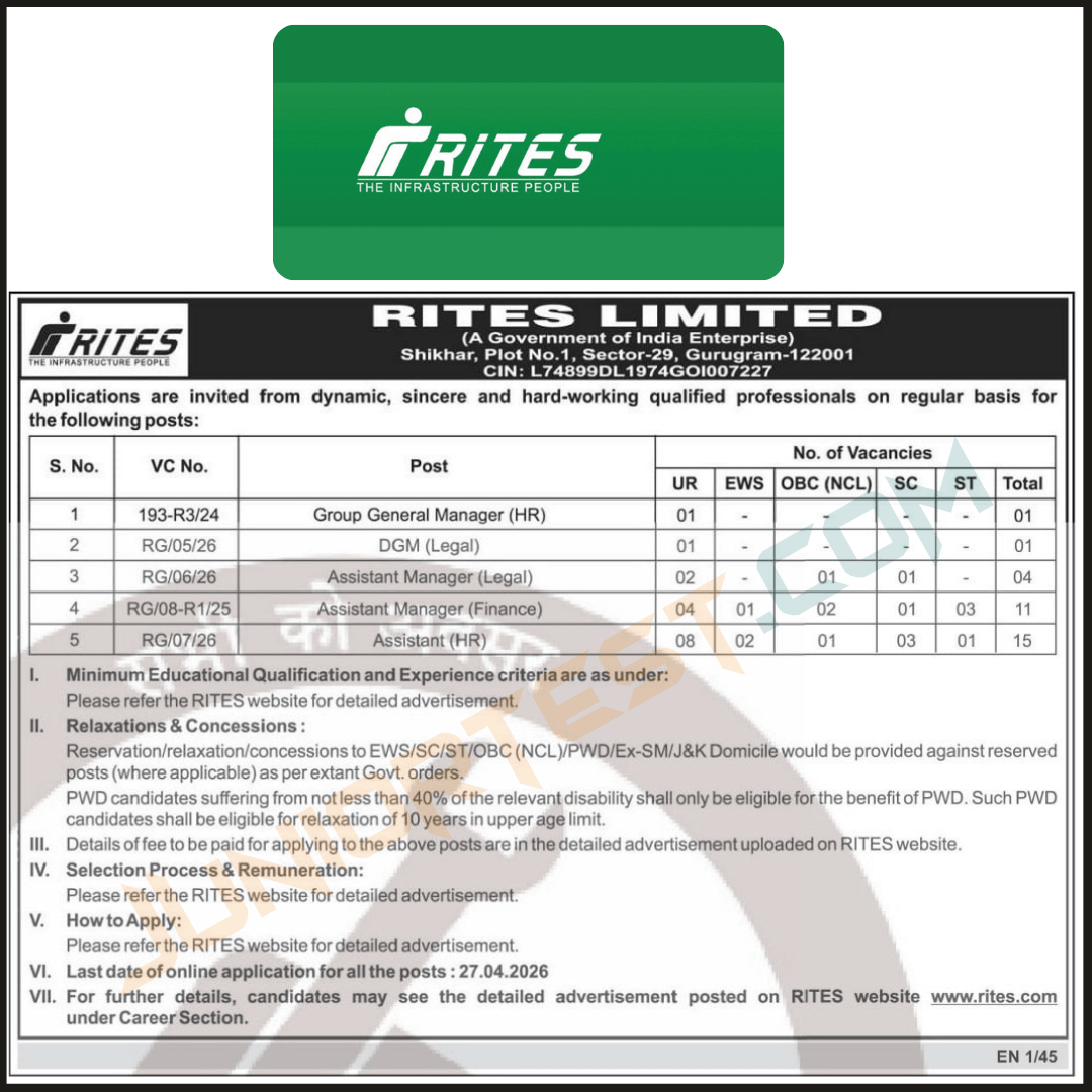 RITES Recruitment 2026 : The current notification includes vacancies for high-level roles such as Group General Manager and Deputy General Manager, as well as several positions for Assistant Managers and Assistants in departments like HR, Legal, and Finance. Candidates seeking a challenging role in the infrastructure sector are encouraged to apply.