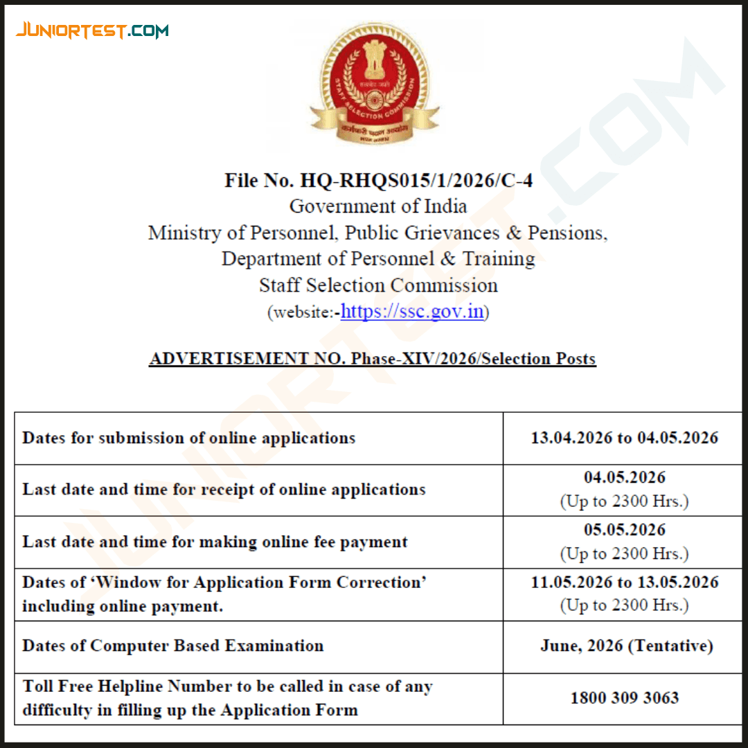 SSC Phase XIV Recruitment 2026 : Eligible and interested candidates can submit their applications online exclusively through the newly revamped official SSC portal (ssc.gov.in). The online registration process officially begins on the 13th of April 2026 and will remain active until the strict deadline of 04th May 2026 (up to 23:00 Hrs). Candidates must carefully read the detailed notification to verify post-specific eligibility criteria, age limits, and examination patterns before completing the mandatory One-Time Registration (OTR) and submitting their online applications.