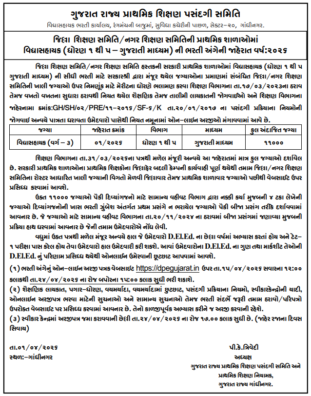 | Vidhyasahayak (Class-3) | Std. 1 to 5 | Gujarati Medium | 11,000 |