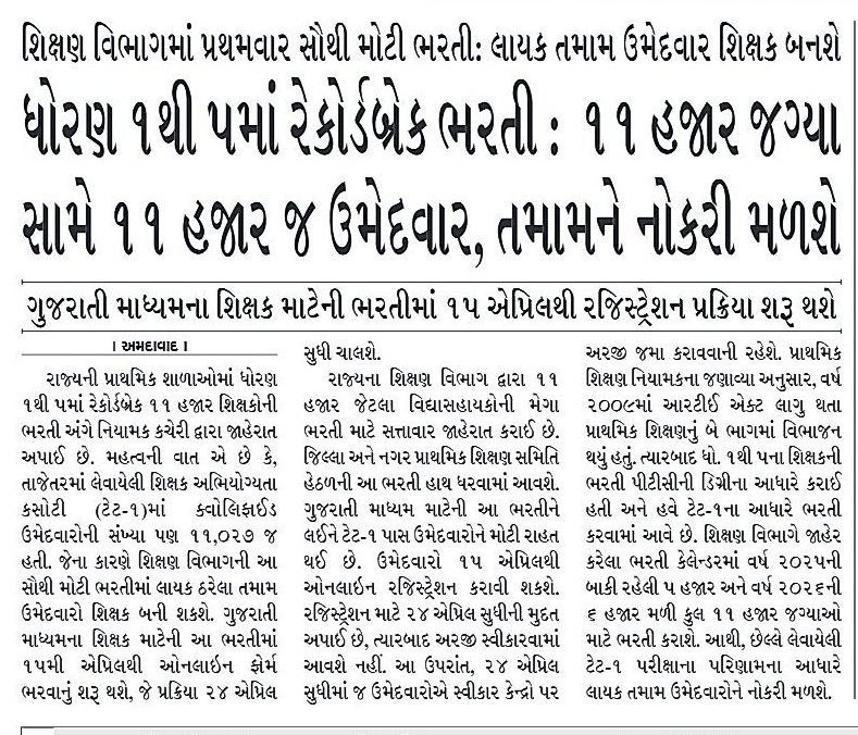 - Recruitment for 11,000 posts of Vidhyasahayak (Std. 1 to 5).