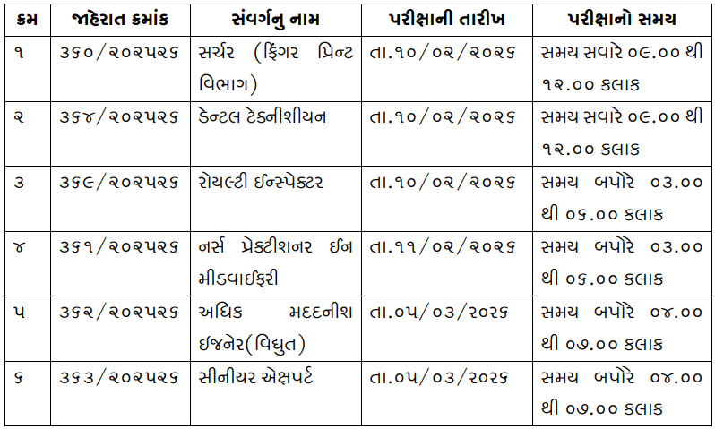 જાહેરાત ક્રમાંકઃ ૩૬૦/૨૦૨૫૨૬, ૩૬૪/૨૦૨૫૨૬, ૩૬૯/૨૦૨૫૨૬, ૩૬૧/૨૦૨૫૨૬, ૩૬૨/૨૦૨૫૨૬, ૩૬૩/૨૦૨૫૨૬, વર્ગ-૩ સંવર્ગોની સ્પર્ધાત્મક કસોટીની તારીખ અંગેની અગત્યની સૂચના