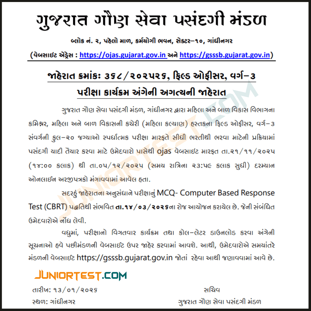 ▪️ ગુજરાત ગૌણ સેવા પસંદગી મંડળ, ગાંધીનગર દ્વારા મહિલા અને બાળ વિકાસ વિભાગના કમિશ્નર, મહિલા અને બાળ વિકાસની કચેરી (મહિલા કલ્યાણ) હસ્તકના ફિલ્ડ ઓફીસર, વર્ગ-૩ સંવર્ગની કુલ-૨૦ જગ્યાઓ સ્પર્ધાત્મક પરીક્ષા મારફતે સીધી ભરતીથી ભરવા માટેની પ્રક્રિયામાં પસંદગી યાદી તૈયાર કરવા માટે ઉમેદવારો પાસેથી Ojas વેબસાઇટ મારફત તા.૨૧/૧૧/૨૦૨૫ (૧૪:૦૦ કલાક) થી તા.૦૫/૧૨/૨૦૨૫ (સમય રાત્રિના ૨૩:૫૯ કલાક સુધી) દરમ્યાન ઓનલાઈન અરજીપત્રકો મંગાવવામાં આવેલ હતા.