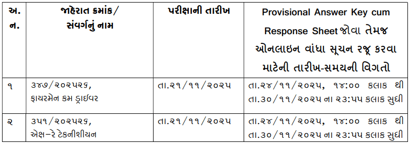 મંડળ દ્વારા પ્રસિદ્ધ કરવામાં આવેલ વિવિધ તાંત્રિક સંવર્ગોની સીધી ભરતીની તા.૨૧/૧૧/૨૦૨૫ ના રોજ લેવામાં આવેલ CBRT પરીક્ષાની Provisional Answer Key cum Response Sheet પ્રસિદ્ધ કરવા બાબતની અગત્યની સૂચના