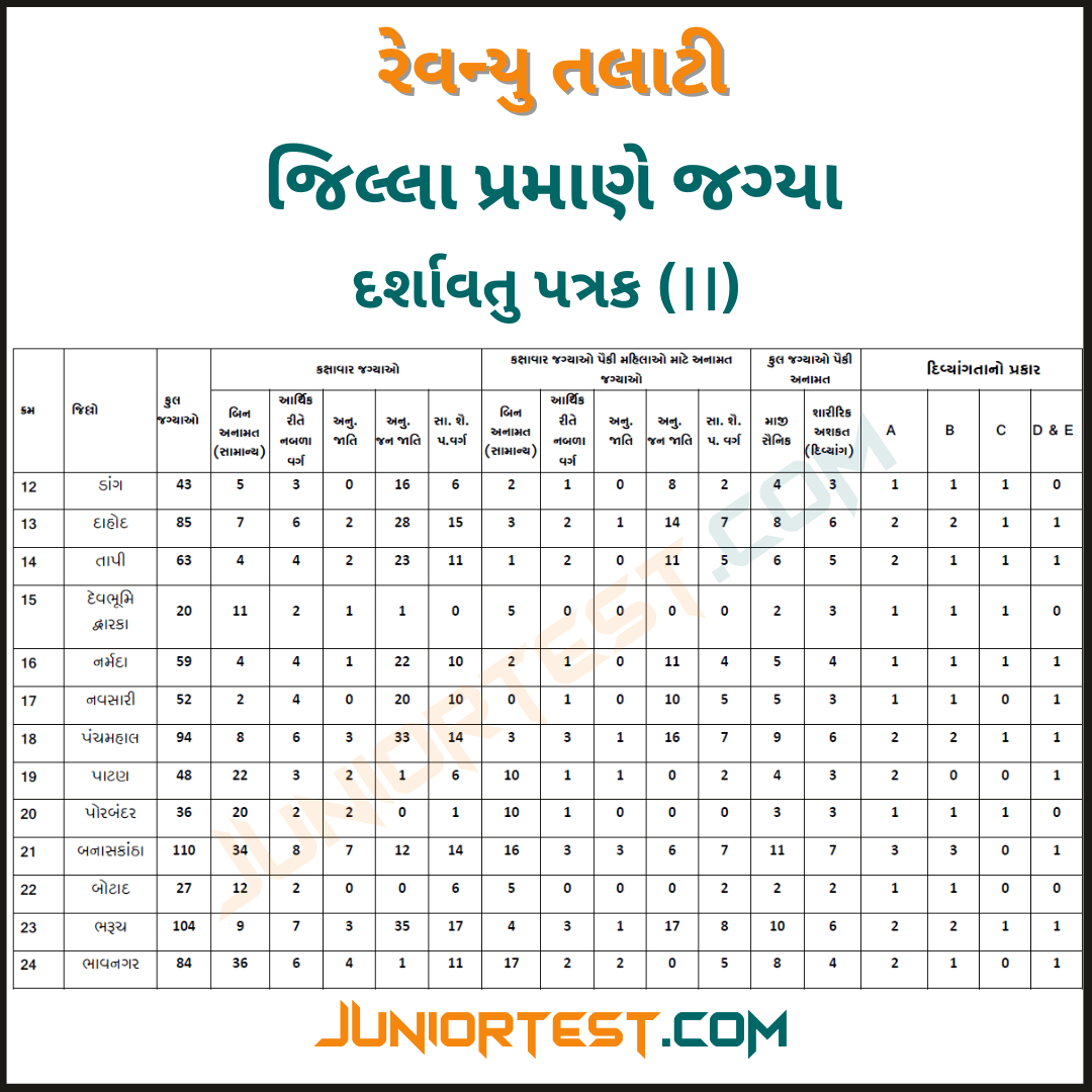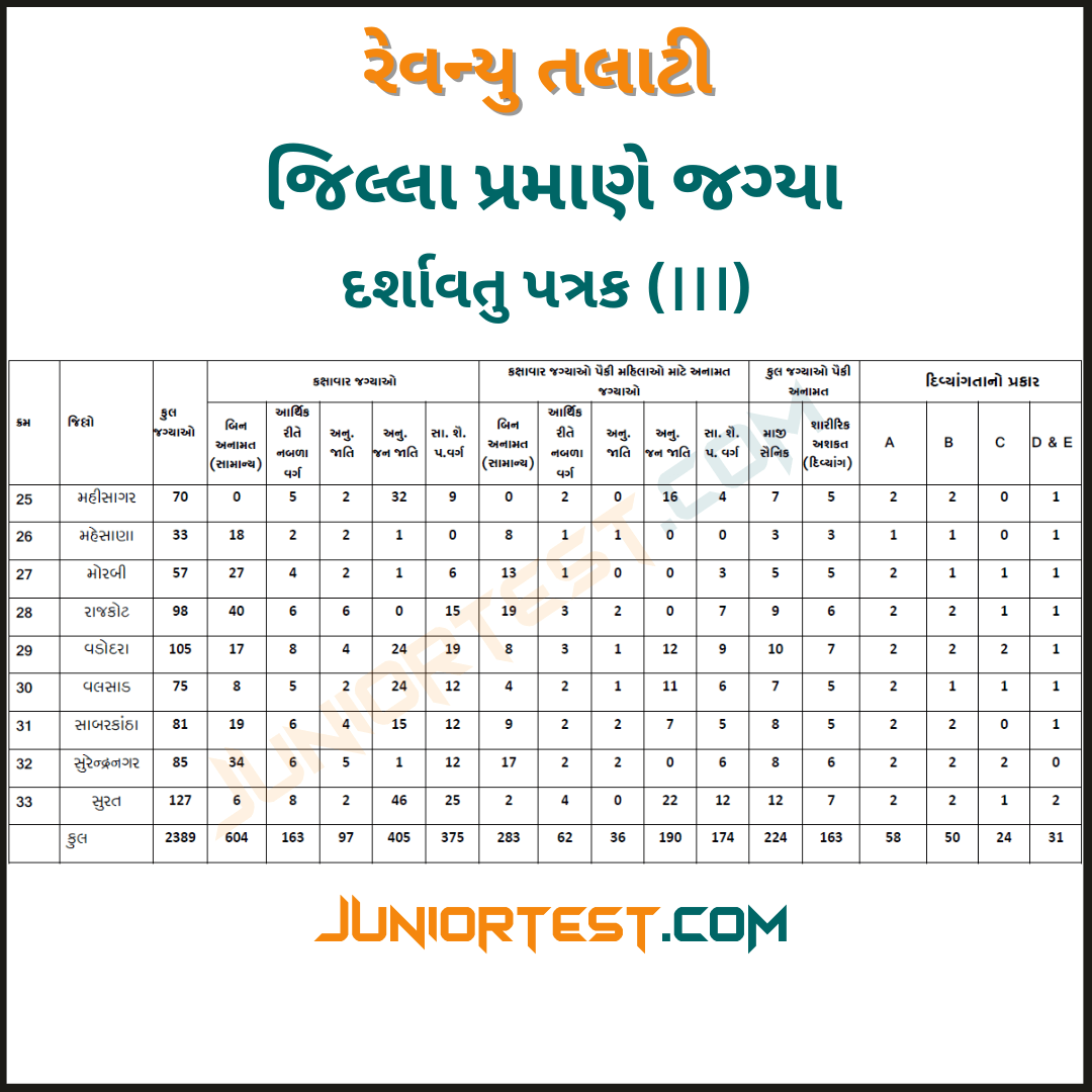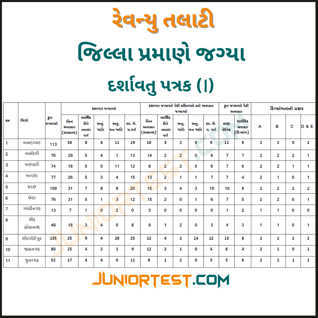 રેવન્યુ તલાટી જિલ્લા પ્રમાણે ફાળવેલ જગ્યાની યાદી દર્શાવતુ પત્રક