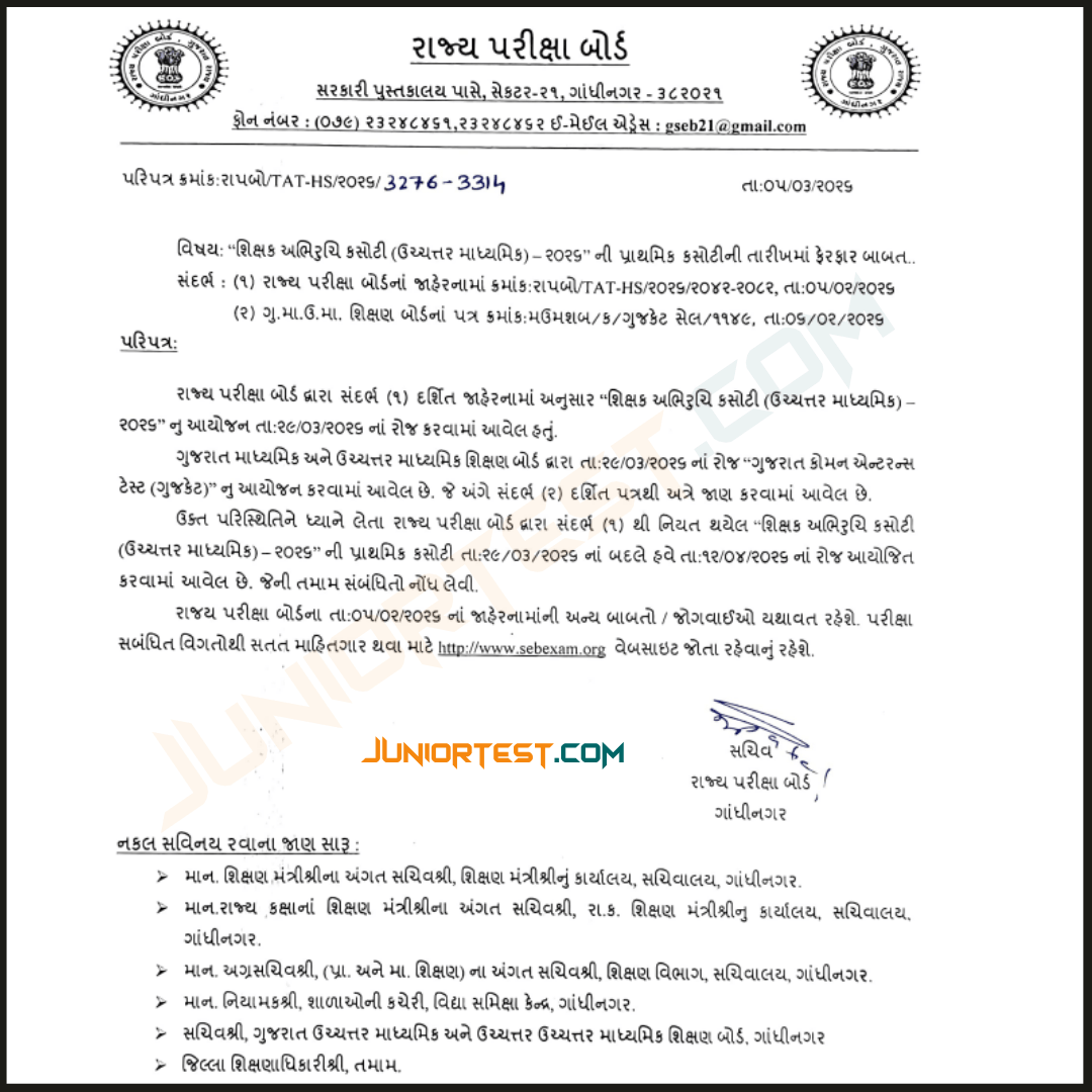 ▪️ શિક્ષક અભિરૂચી કસોટી (ઉચ્ચત્તર માધ્યમીક)ની તા. 29/03/2025 નાં રોજ લેવામાં આવનાર પરીક્ષા અન્ય કારણોસર રદ્દ કરેલ હતી.